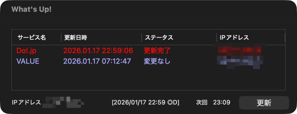 取得したグローバルIPアドレスに変更があるときのみ実際の更新処理をサービスに対して行っています。